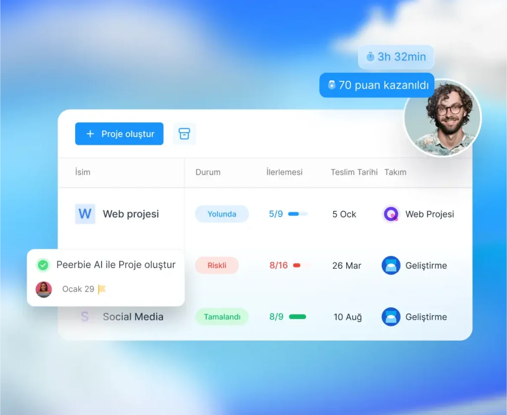 Peerbie, yapay zekâ destekli proje yönetimi, iş akışı otomasyonu ve ekip iletişimini tek platformda birleştirir; görev atamalarından canlı raporlara kadar tüm süreci otomatik yürütür.
